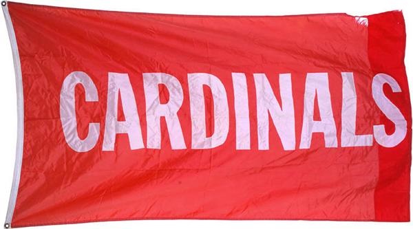 Large, about 10' flag, that flew over Busch Field in St Louis. Made of durable canvas, the only damage is some fraying on the edges caused by the wind. No major holes or tears.