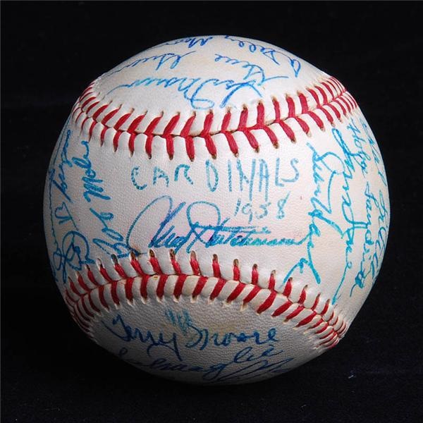 Official National League Giles Baseball signed by 27 members of the team including Stan Musial, Fred Hutchinson, Sal Maglie, Stan Hack, Mizell, Wally Moon, Ken Boyer, Terry Moore, Lindy McDaniel and more. Signatures are very bold and a solid "9-10" on scale of 1-10. Ball is just lightly toned.