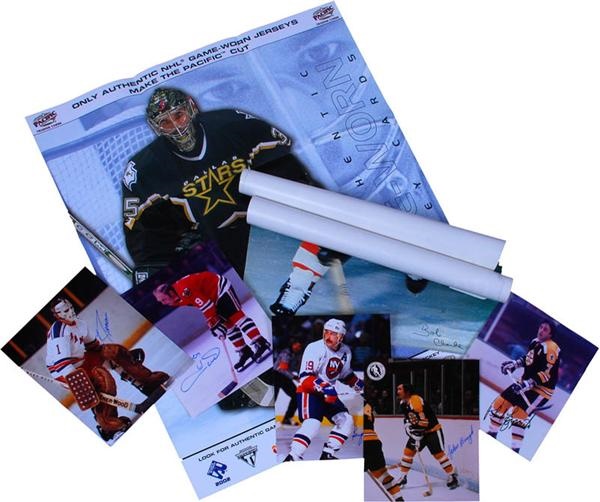 Hodge Podge lot of signed photos and some vintage posters. Includes signed 8 x 10'' photos: Phil Esposito, Bobby Hull, Ed Giacomin, Bryon Trottier, John Bucyk. Also includes (5) Bauer Sporting Goods posters from the 1970s picturing Bobby Clarke, Brad Park, Bernie Parent and more. NM-MT.