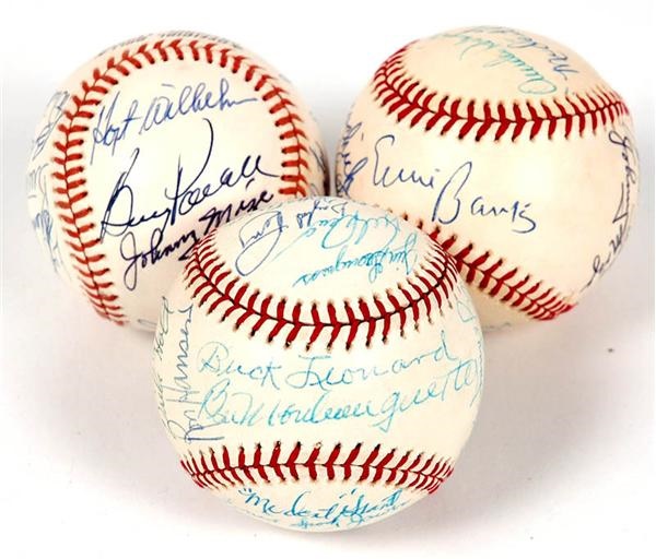 Lot of three multi-signed baseballs with signatures obtained by our consignor at various spring training games. Includes OAL MacPhail ball with 12 signatures including Ernie Banks, Enos Slaughter, Jim Honochick, Johnny Mize, Gaylord Perry and more. ONL Feeney ball signed by 12 including Ernie Banks, Gaylord Perry, Johnny Mize, Boog Powell, Hoyt Wilhelm, Bill Mazeroski, Dick Groat and more. Finally OAL MacPhail ball signed by 25 including Jim Hunter, Jackie Jensen, Buck Leonard, Johnny Mize, Gaylord Perry, Enos Slaughter, Ernie Banks, and more. All are EX-MT with bold ink signatures.