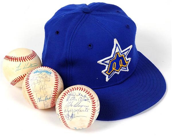 Includes New Era Size 7 1/4 game model hat (no use), Lee Gutterman single signed OAL Bobby Brown Baseball, Mid-1980s team signed OAL Bobby Brown Baseball with 30 signatures (EX), and finally 1980s Mariners minor league team signed MacGregor ball with 16 signatures (EX).
