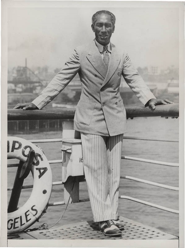 An historic image of swimming legend Duke Kahanamoku arriving in Los Angeles to attempt to make his fourth Olympic swimming team-eight years after his last Olympics! The image measures 6 x 8 and is NM in condition, clarity and contrast.