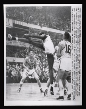 Rich vintage photograph of the legendary Bill Russell in his first ever Boston Celtics and NBA game. Boston Garden December 22, 1957 versus the St. Louis Hawks. He is, of course, coming down acrobatically with the rebound. U.P.I. and N.E.A. stamps on verso as this is from the famed "Cleveland Collection" of the Scripps-Howard newspaper chain.