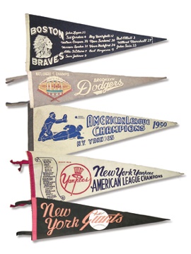 Add some color and charm to your trophy room with these felt masterpieces straight from Baby Boomers' childhood walls. 1) Brooklyn Dodgers Nat'l League Champs (26"). EX with tack holes. 2) Boston Braves roster (27"). EX+. 3) New York Yankees American League Champs (28"). Rounded at tip, otherwise EX. 4) New York Yankees American League Champs roster (29"). Tack holes, torn tip, some staining. VG-EX. 5) New York Giants (27"). EX+ with tack holes.