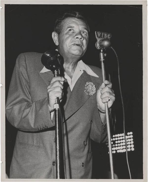 One lot of two vintage 8 x 10'' photos of Babe Ruth at the microphone. One is back stamped by photographer Bob Lavelle, the other is for an apperance on the radio show "Gang Busters." EX-MT.