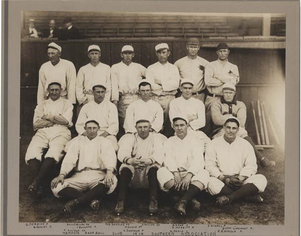 8.5 x 11'' cabinet photo of the Memphis Baseball team of the Southern League. All of the players are identified at the bottom including Dolly Stark (later became umpire), Admiral Schlei, Bill Steele and possibly more. Very clear image. Some scrapbook residue on the back of the mount, front is NM-MT.