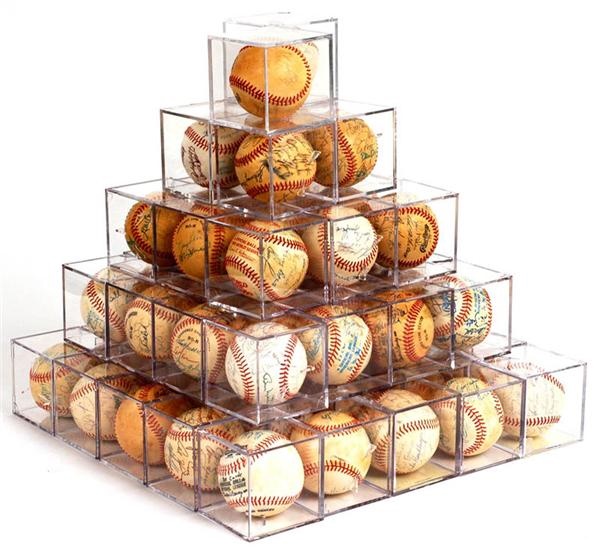 Lot of fifty-six full team and partial team signed baseballs. All are are signed on OAL or ONL balls unless otherwise noted. Includes 1982 Phillies, 198? Royals (partial), 1981 Athletics, 1983 Reds, 1982 Reds, 1982 Royals (partial), 1982 Indians, 1982 Dodgers, 1979 Royals, 198? Phillies (partial), 1981 Reds (partial), 1983 Mariners, 1978 Pirates, 1981 Dodgers (partial), 1980 Cardinals (partial), 1979 Giants, 1982 Pirates (partial), 1982 Angels (partial), 1966 KC Athletics, 1981 Dodgers (3 signatures on World Series ball), 1978 Red Sox, 1983 Astros, 1983 Reds (partial), 1983 Tigers (partial), 1980 Phillies (Partial on World Series ball), 198? Mets (Partial), Early 1970s Royals, 1982 Expos, 1980 Expos (partial), 1983 Dodgers, 1982 Astros, 1983 Athletics (partial), 1983 Mets (Partial), 1982 Cubs, 1983 Athletics, 1981 Astros, 1982 Padres (partial), 1983 Yankees, 1981 Pirates, 1982 Orioles, 1981 Cardinals, 1980 Red Sox, 1983 Braves, 1981 Cardinals, Early 1970s Royals, 1980 Reds (unofficial), 1980 Tigers, 1983 Cardinals, 1980 Cardinals, 1980 Twins (partial), 1982 Red Sox (partial), 1982 Pirates, 1980 Angels (partial), 198? Cardinals, 1984 Cardinals and 1980 Cubs (partial). Conditions range from Good to EX+ with most VG to EX.