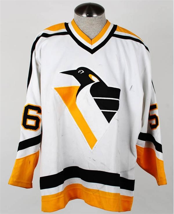 A steady defenseman over the years, Zubov donned this jersey for the Penguins as they made their march to the Eastern Conference Finals in 1995-96. Jersey is all original with Zubov's name attached to a name-length nameplate on the back. CCM and size 54 tagging in the collar. "56" written on the tag in black marker. Moderate to heavy use with stick marks, burns, paint tranfers, and some pilling inside.