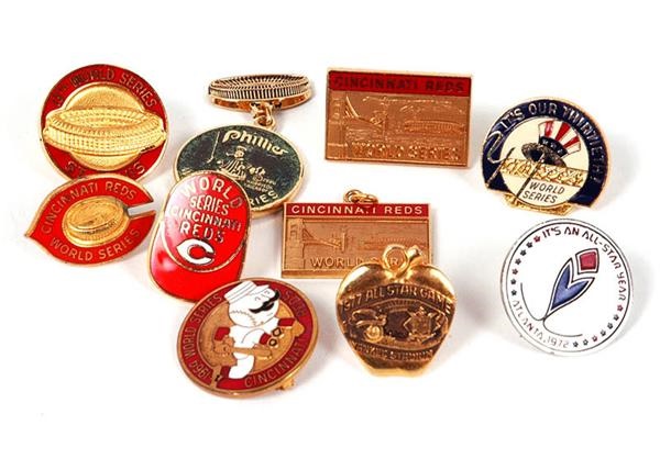 Includes 1964 Cincinnati Reds Phantom, 1976 Yankees, 1975 Reds, 1972 Reds, Two undated Cincinnati Reds World Series Phantoms (pin and charm), 1982 St Louis Cardinals, 1980 Phillies, 1977 All-Star Game and 1972 All-Star Game. Conditions range from VG/EX to Mint with most NM-MT.