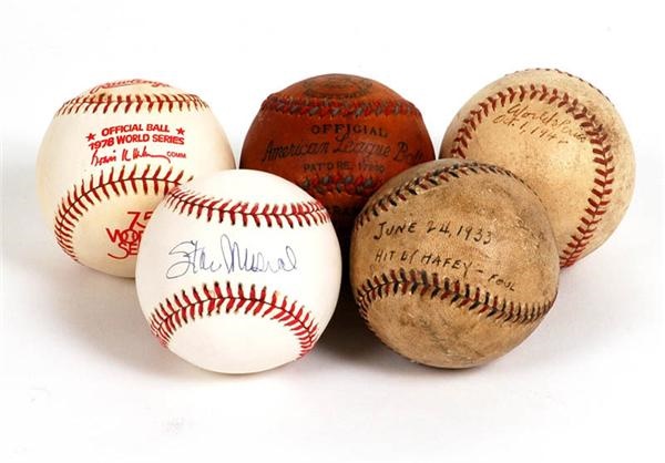 One lot of five Baseballs. Includes Foul Ball hit by Chick Hafey June 24, 1933. Ball used in the World Series Oct 1, 1944. 1930s Official American League Baseball with red and blue stitching (light use, but well toned). 1978 World Series Official Game Baseball. Stan Musial single signed Rawlings Baseball.