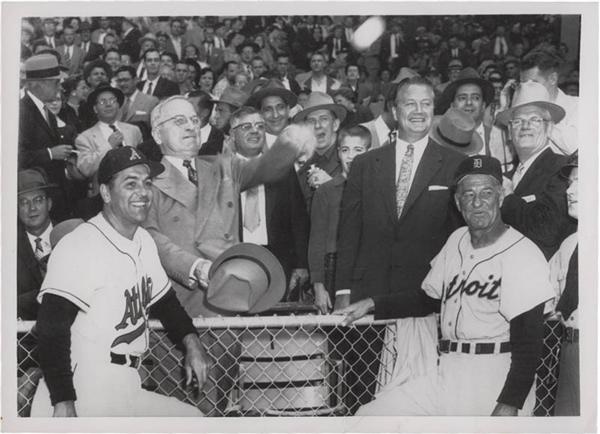 One lot of six photographs of United States Presidents attending Baseball Games. Incldues 1949 Truman throws out 1st pitch, 1949 Truman signing Baseball for player, 1949 Truman throwing out 1st ball with both hands, 1950 Senator Taft throwing out 1st ball, 1955 Truman throwing out 1st pitch with Lou Boudreau and Bucky Harris, finally 1956 Eisenhower at the ballgame. About 6 x 8'' or slightly smaller. EX-MT