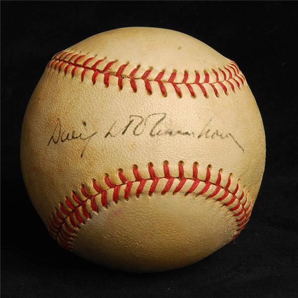 Official National League Giles Baseball signed on the sweet spot by President Dwight D. Eisenhower. Bold black ink signature is a solid "8" on scale of 1-10. Displays as a beautiful single signed ball, but under a black light, some writing on the side panels has been removed, probably an inscription written by the original owner. As evident by the toning, this is most likely a game used ball. Rare opportunity!