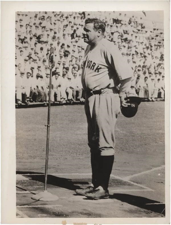 6.5 x 8.5'' wire photo of Babe Ruth at the microphone on a trip to Honolulu HI. Dated Nov 2, 1933. EX-MT.