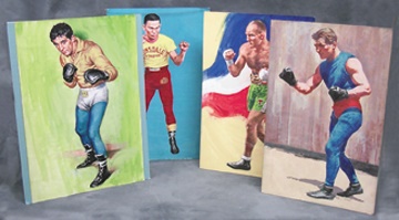 Historically fascinating collection of oils on board and canvas from many different countries and eras. Includes Andre Rout, Pone Kingpetch, Freddie Miller, Jack Britton, Sammy Mandell, Eder Jofre, Nino Benvenuti, Ken Buchanan, Marcel Thil, Howard Winstone, Chartchai Chionoi, and Bobo Olson. The thing they all have in common is that they are all great fighters and champions. Ring Mundial Oil-On-Canvas Original Cover Art Spectacular oil paintings were used for the cover of this, the preeminent Mexican boxing magazine of the last few decades: Ring Mundial. These one-of-a-kind paintings which are mostly oil-on-canvas (they were then mounted on artist's board) each measures about 20x15". They are in EX-MT condition and were obtained from the daughter of Valente Perez, the sportsman-entrepreneur-artist who published the magazine but also did these paintings! A wonderful collection.
