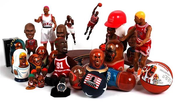Mostly related to Michael Jordan, there is a wide array of material in this lot including product endorsement store ads, product samples, Michael Jordans Nissan License Plate holder, several one of a kind wood hand painted Russian Dolls, Michael Jordan Cologne (different types), Wizards Watch, Bobbin Head Dolls, and more.  A box load of material for the die-hard Bulls fan.