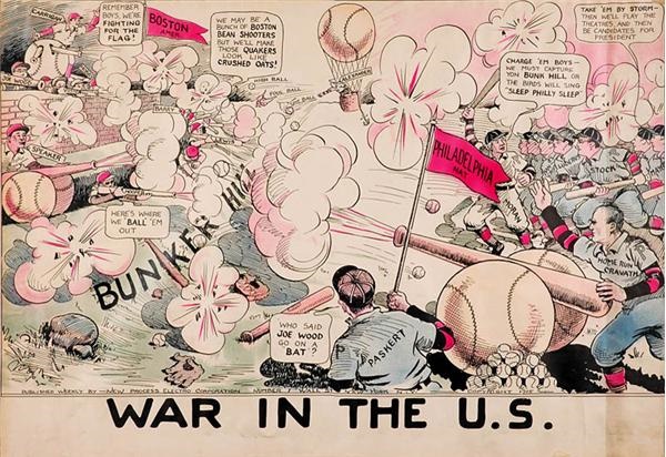 Vintage 21 x 30'' poster issued by the New Process Electro Corporation.  Colorful artwork keyed to the World Series with the Boston Red Sox battling the Philadelphia Phillies.  Players mentioned by name include Tris Speaker, Harry Hooper, Duffy Lewis, Home Run Cravath, and more.  Appears to be trimmed slightly on the edges.  Mounted to board.  Excellent appearance.