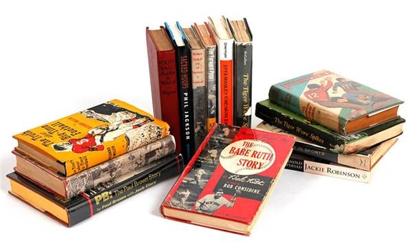 One lot of (14) books. Includes "The Paul Brown Story" inscribed and signed by Paul Brown on the fly. "Better Athletes" by Bob Hoffman. "The Truth about Big-Time Football" by Richard Miller. "Interference" by Harold Sherman. "Football and How to Watch It" by Percy Haughton. "Sacred Hoops" by Phil Jackson. "Modern Football for the Spectator" by Charles Caldwell. "The Forward Pass" by Charlie Conerly". "Effa Manley and the Newark Eagles" by James Overmyer. "The Babe Ruth Story" by Bob Considine (VG). "The Tiger Wore Spikes" by John McCallum (2 books, one P/G, the other VG). "Jackie Robinson" by Arnold Rampersad (softcover), and "Negro First in Sports" by Doc Young. All are hardcover and excellent unless otherwise noted.