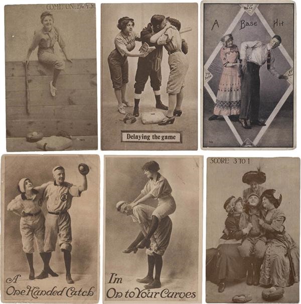 Comprehensive lot of (61) postcards featuring men and women in love with a Baseball theme. Several different series are represented, some of which are very scarce. There is little to no duplication. Conditions range from Poor to Excellent with most VG.