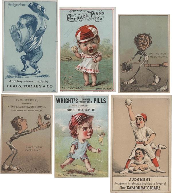 Extremely comprehensive lot of (123) 19th century Baseball trade series. Many series are represented here including cards illustrated by Tobin (no major league), Forbes, Brown (Capadura Cigar), Gargling Oil, Brownies, Coffee Advertising and more. Several are trimmed (not unusual for trade cards). There is little to no duplication. Conditions range from Poor to Excellent with most Good to VG.