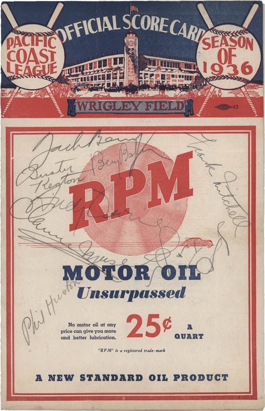 Official Wrigley Field Pacific Coast League Baseball 4-page scorecard for the Comedians vs Umpires exhibition game. Signed on the cover in pencil by Buster Keaton, Jack Benny, Frank Mitchell, Phil Huston, Andy Devine, Benny Baker and more. Some minor creases, signatures are bold.