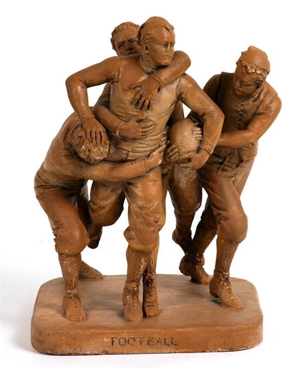 Masterful depiction of an early game is football at its antiquated best. Stunning rendition in molded plaster of the players in union suits trying to pull down a runner with trademark stocking cap of this Ivy League dominated era. The detail is fantabulous from the lacing in the melon ball to the expressive faces that seem to scream “Heffilfinger.” Statue is by the great John Rogers who was the top commercial statue maker of the time. His line covered everything from Civil War to classical themes at prices that just about everyone could afford. This was from the days of Sears & Roebuck delivered via Wells Fargo wagons allowing previously secluded America access to popular culture. Some very minor paint chips (nothing) but overall excellent condition with original paint and patina. Base is entitled “Football” with the John Rogers 19 West 12 S New York” incised. Reproductions exist, but this is original. A stately 16.5x11x10”.