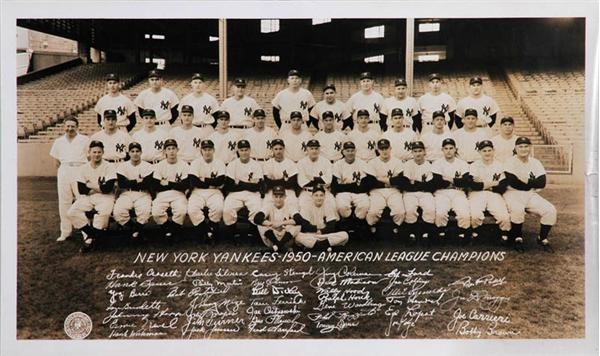 12 x 20'' presentation photo of the 1950 World Champion Yankees team. Each player has facsimile signed at the bottom including Yogi Berra, Joe Dimaggio, Billy Martin, Johnny Mize, Casey Stengel, Bill Dickey, Phil Rizzuto, Whitey Ford and more. Near Mint. LOA from the Dimaggio family.