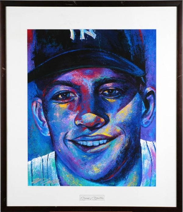 18 x 22'' artist signed print matted with mint blue ballpoint signature of Mickey Mantle. Print is #1/177. Framed to 25 x 29''. Some scratches on the wood frame, otherwise Mint.