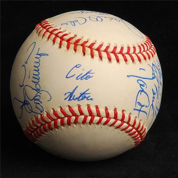 Official 1993 World Series ball has been signed by 18 members of the World Champion Toronto Blue Jays. Includes: Olerud, Williams, Hentgen, Leiter, Cox, Sprague, Timlin, Coles, and more. Signatures rate Mint. Ball is NM to Mint.