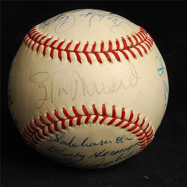 Official National League (Giles) ball has been signed by 15 former players. Includes: Pee Wee Reese, Ralph Kiner, Rex Barney, Bob Feller, Buck Leonard, Luke Appling, Billy Herman, Sadaharu Oh, Early Wynn, Bill Terry, Lloyd Waner, Earl Averill, Yogi Berra, Stan Musial and Don Sutton. Signatures rate 8 to 10 out of 10. Ball has some light toning.