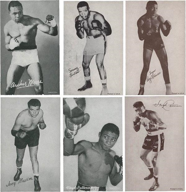 Huge lot of (162) postcard sized Boxing exhibit cards. Loaded with stars such as Billy Conn, Marcel Cerdan, Kid Gavilan, Slug Walcott, Henry Armstrong, Ezzard Charles, Jake Lamotta, Sonny Liston, Archie Moore, Floyd Patterson, Ray Robinson, Joe Walcott and more. There are a few duplicates (most of the dups are star cards), but the vast majority are different. VG-EX to Mint with most EX/EX+ or better.