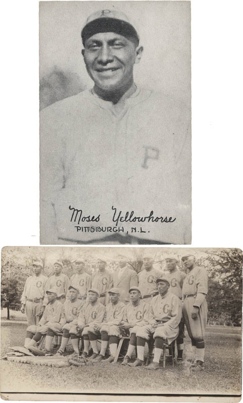Nice lot of (2) Native American baseball themed items. Includes: Moses Yellow Horse exhibit card from 1922 while he was a pitcher for the Pittsburgh Pirates (NM); 1910's team photo postcard of a baseball team from the Chilocco indian school (EX). Fascinating images!