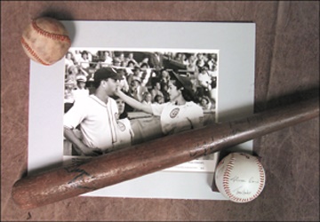 From the Tom Hanks, Madonna baseball megahit feature film. Includes an actual prop baseball bat, used in the film. The bat is signed by Madonna, Geena Davis, Penny Marshall and faintly by Tom Hanks, a prop baseball, and a promotional ball for the film with facsimile signatures of the stars, plus three promo photos (8x10").