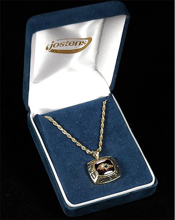 14 karat gold pendant has stamping on the back. Purple stone with gold ravens head on the top. "2000 Baltimore Ravens" surrounds the stone. NRMT in original box.