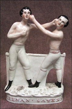Generally considered the greatest fight of the bare-knuckle era, the Heenan-Sayers bout was held secretly at four a.m. in a meadow at Farnborough, England to avoid police interference.  The bloody two hour, forty-two round match ended in a draw when a mob of spectators flooded the ring and made further battling impossible, and a vote of British and American judges resulted in a draw.  Gorgeous Staffordshire porcelain memento of the fight is one of the very rare surviving authentic examples.  Reproductions are easily spotted, as they are closed between Sayers' legs.  Condition ranks this one easily in the top five percentile of all authentic specimens.