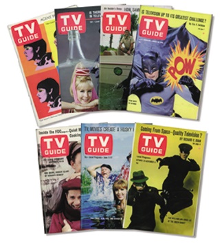 Absolutely complete run of this possibly the greatest year of TV shows of all. This key year includes covers of: Batman, Green Hornet, Beverly Hillbillies, U.N.C.L.E. (2), I Dream of Jeannie (2), Gomer Pyle, Lucy (2), Walter Cronkite, Flipper, My Three Sons, Johnny Crayon, Daktari, Dean Martin, Big Valley, Gunsmoke, Girl From U.N.C.L.E., I-Spy, Hogan's Heroes, Gilligan's Island, Andy Griffith, Green Acres, That Girl, Tarzan, Gidget, Frank Sinatra, Fall Preview, F. Troop, Bewitched, and Get Smart (2) one by Andy Warhol. Overall NRMT.