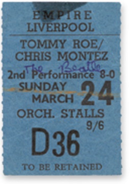 In what was probably perceived as a snub of this fan's beloved local faves, she has added "The Beatles" in her own hand to this Liverpool ticket. Taped into the same scrapbook as the handbill.