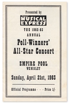 This was the group's first of four annual appearances at the prestigious New Musical Express Poll-Winners' concert at London's Wembley Arena. Riding the crest of two successive number one singles warranted the addition of the Beatles to the bill, even though they had won no award! That, of course, would change by 1964. 16 pgs. Ex. 5 ?"x9"