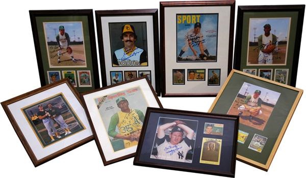 Interesting signed display collection. A signed photo is custom framed with cards of the player. Includes Rollie Fingers with cards. Vida Blue with cards. Bert Campanaris with cards. Gene Tenace with cards and 1973 World Series ticket stub for Game 3. Vida Blue Sporting News Cover. Gil McDougald signed with 1953 Bowman color, 1956 Topps and 1957 Topps. Mark McGwire and Reggie Jackson dual signed 8 x 10, and Whitey Ford signed 8 x 10 and gold HOF plaque postcard. All of the signed items are personalized "To Frank" except for the McGwire / Jackson 8 x 10 and Ford plaque postcard. Each frame is about 16 x 22'', give or take a few inches. Bold sharpie signatures!
