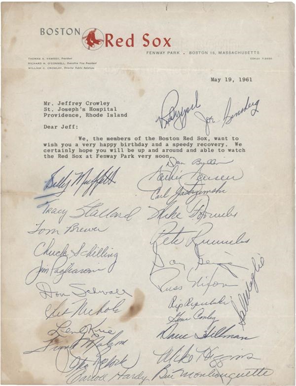 (26) signatures on Red Sox Letter head. Signatures include Carl Yastrzemski, Tracy Stallard (year he threw #61 to Maris), Mike Higgins, Sal Maglie, Jackie Jensen and more. Creases and some staining. JSA LOA.