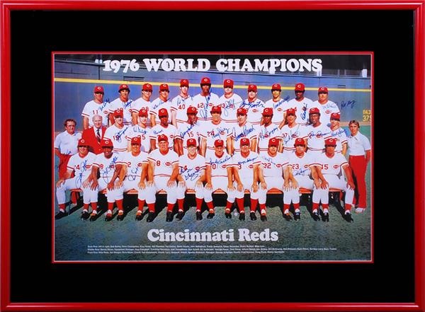 Super poster commemorating baseball's 1976 World Series champs, the Cincinnati Reds. The team photo is signed by almost everyone pictured, including: Dave Concepcion, George Foster, Johnny Bench, Ken Griffey, Pete Rose, Joe Morgan,. Sparky Anderson and more. All signatures are in mint blue Sharpie. Poster is framed to 36 x 48" and appears in mint condition. Nice piece.