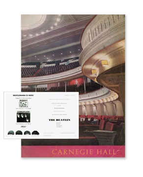 The Fab Four arrive in America. The group's first New York City appearance was held at the renowned concert venue, Carnegie Hall, three days after their Ed Sullivan Show debut. Note the typo on page 11 (John McCartney). A wonderful Capitol ad proclaims "Beatlemania is Here!…England's #1 Recording Stars have Americas's #1 Hit Single and America's #1 Hit Album". The 18-page program exhibits moderate creases in upper and lower right corners of front cover. Excellent condition with corner creases.