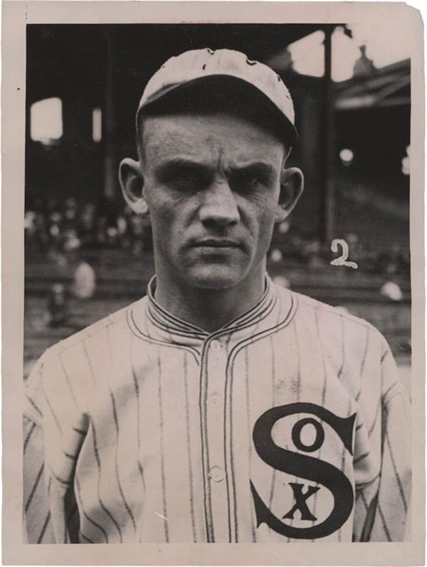 6.5 x 8.5" vintage news service photo of first baseman Chick Gandil, one of eight Chicago White Sox players indicted in baseball's 1919 "Black Sox" scandal. Original image had an editing mark. Printed about the time of the scandal. Top right corner is torn, but otherwise photo is in great condition.