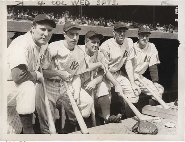 The New York Yankees were fielding a fierce line-up and at the top of baseball's American League when this news service photo was taken in August of 1938. Captured leaning on their bats in the dugout are: Charley Ruffing, Joe DiMaggio, Bill Dickey, Lou Gehrig, Bill Dickey and Monte Pearson. The 6.5 x 8.5" photo has the original caption sheet and news clipping affixed to verso. Also, some editor enhancements visible on this excellent photo.
