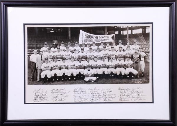 12 x 19'' panoramic photograph of the National League Champion Brooklyn Dodgers with facsimile signatures of each player printed in the bottom border. Players pictured include Duke Snider, Gil Hodges, Pee Wee Reese, Roy Campanella, Jackie Robinson, Carl Furillo and more. Crystal clear image has a few minor bends visible on close inspection and presents EX-MT. Framed to 19 x 26''.