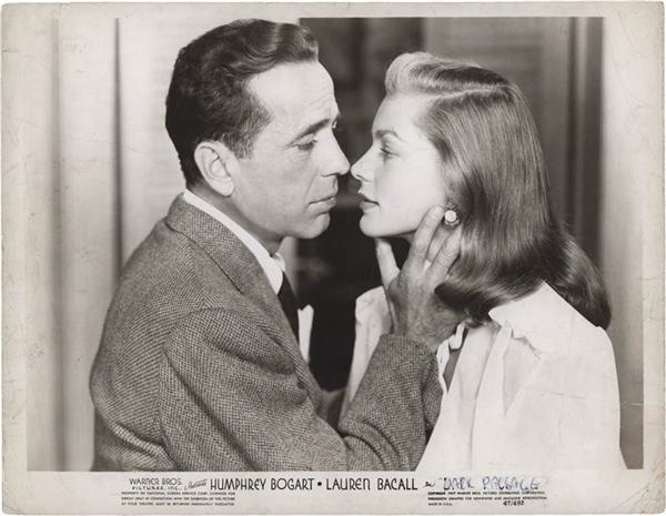 8 x 10'' movie still with crystal clear image of both great actors. The name of the movie "Dark Passage" has been written in blue ballpoint. Corner rounding and light edge wear. VG-EX.
