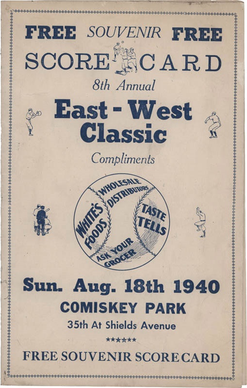 Very rare 4 page program/scorecard for the 1940 East-West Classic All-Star Game held at Comiskey Park in Chicago. Pre-Printed line ups include Buck Leonard, Easterling, Hughes, Hoskins, Stone, Mule Suttles, Gene Benson, Buster Clarkson, Perkins, Ruiz, Ray Brown, Greent, Milson, Sampson, Riddle, Morney, Robinson, Green, Brown, Reeves, Mayweather, Taylor, Woods, Wright and more. A few game notes are made in pencil on the score page. Unscored. Small tear on the spine about 1/4 up from the bottom, mostly visible from the back. Excellent overall condition.