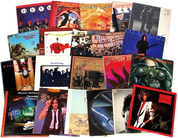 Fantastic collection that reads like a greatest hits list from the 60s, 70s & 80s. Names include: James Taylor, Sammy Hagar, Elvis Costello, Jefferson Starship (Paul Kantner, Devie Freiberg & Pete Sears), Donovan, Eddie Money, Mickey Hart, Michael McDonald, Ian Anderson, Paul Kantner, Bruce Hornsby, Linda Ronstadt, Joe Satriani, Mickey Thomas, Huey Lewis, Elvin Bishop, Country Joe McDonald, Rickie Lee Jones, Frank Beard of ZZ Top, Cyndi Lauper, KD Lang and Devo. Most of the signatures are in blue sharpie and are NRMT.