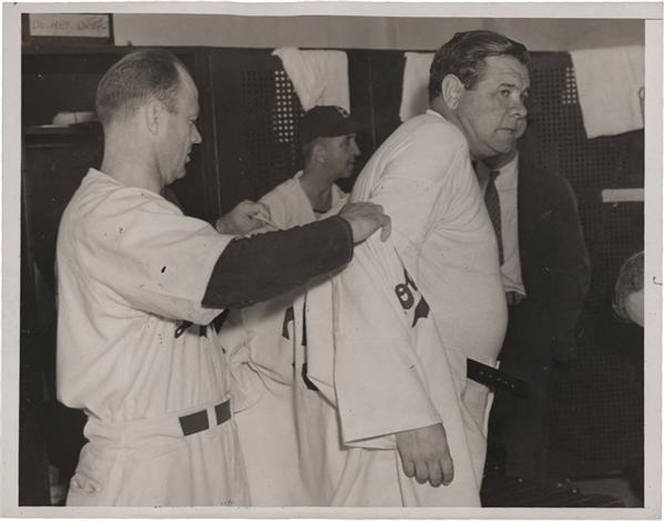 7 x 9'' news service photo of Babe Ruth putting on his jersey the day that he made is debut as Brooklyn Dodgers coach. Acme News stamping on the verso along with the original caption sheet. EX-MT