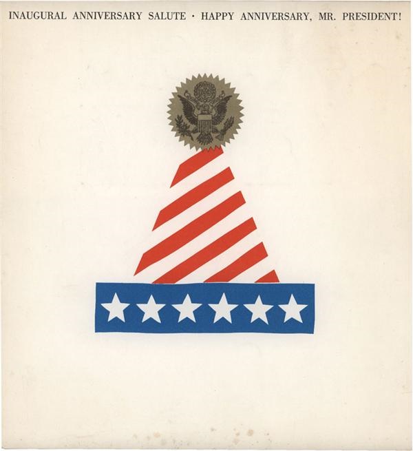 Six page program for the Second Inaugural Salute with two full tickets affixed to one of the pages. Listed inside are celebrities to attended the event including Gene Kelly, George Burns, Peter Paul and Mary, Kirk Douglas, Carol Burnett, New York City Ballet, LBJ and more. Near Mint.