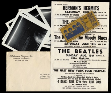 Collection of ten items relating to one of the most famous concerts in Rock History. The Beatles appearance at Shea Stadium on August 15th, 1965. The first item in this collection is a super-rare original handbill advertising this concert as well as four other concerts: Herman's Hermits, The Dave Clark 5, The Kinks and The Moody Blues, THE BEATLES - August 15th, The New York Folk Festival with Phil Ochs, Chuck Berry, Johnny Cash, Muddy Waters, Mississippi John Hurt, others. Folded in thirds for mailing a few light stains (EX). The next item is a Loge reserved ticket stub for the concert that was laminated by the original owner. Next is the original mailing envelope that the tickets and the handbill was sent in, postmarked June 4th, 1965 and with Sid Bernstein Enterprises, Inc. return address. The next six items in this collection are black and white photos of the stadium taken by the fan at the show. They are poor photos taken from a distance but they add to the charm of this collection. A new world record for a pop concert was created when more than 55,000 fans attended this legendary outdoor concert at Shea Stadium, and the Beatles also set a world record with their $160,000 share of the $304,000 gross receipts. The show was filmed by Ed Sullivan Productions for a 50 minute TV special that the BBC first aired on March 1, 1966. From a different vendor .